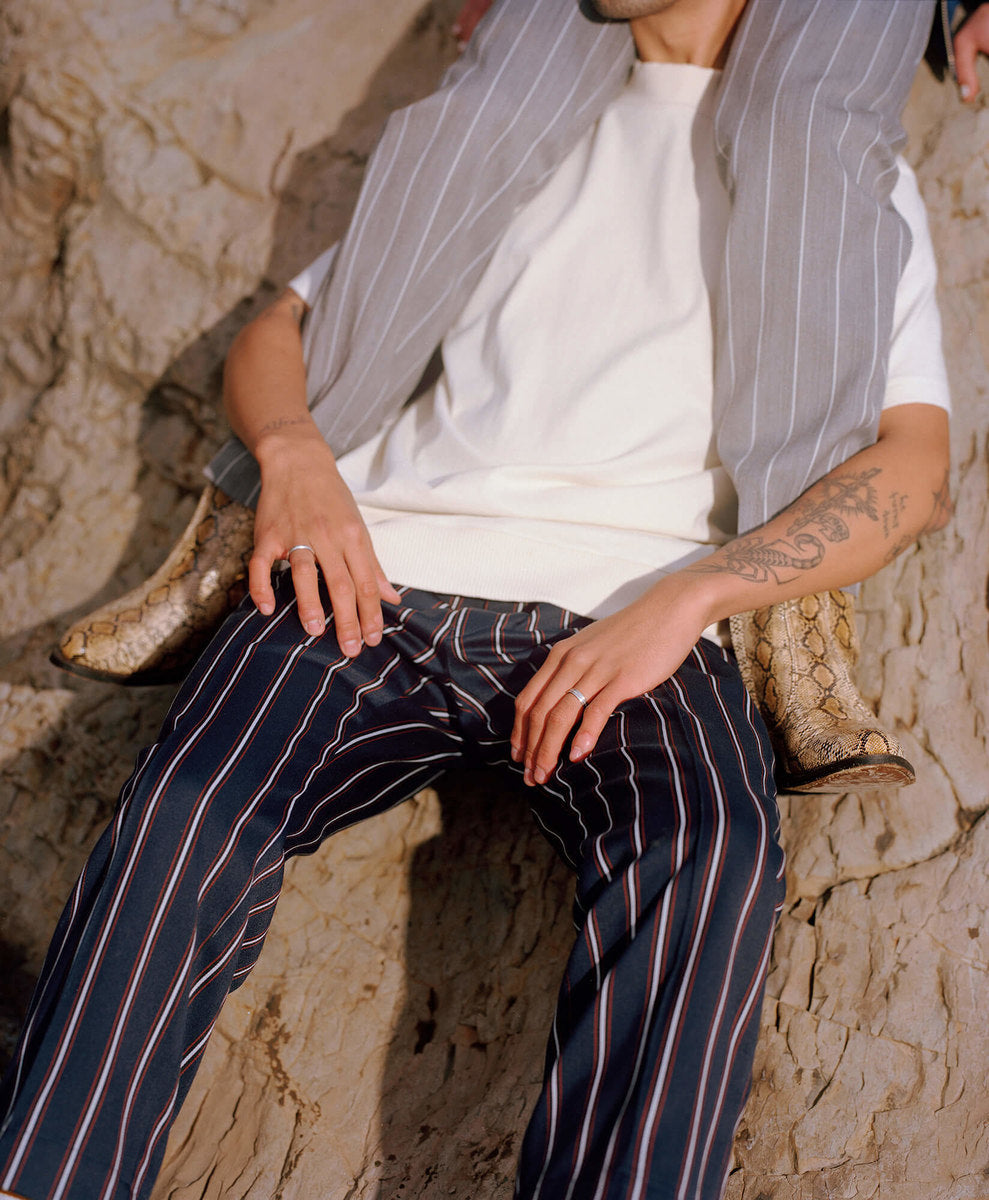 The fall winter 2018 collection was inspired by the idea of secret societies and the aesthetics and sounds that come from that world. Details include music references like enlarged polo-shirt buttons fashioned like vinyl records, speakeasy-style pinstripes, and hidden detailing like embedded waistband lace loops or invisible zippers. A few of the styles feature constructions that encourage the individual to wear pieces variably.